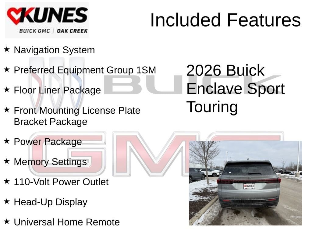 moonstone gray metallic 2026 Buick Enclave Sport Touring AWD 8-Speed Automatic 2.5L DOHC AWD, 110-Volt Power Outlet, 1st and 2nd Row All-Weather Floor Liners, 2nd Row 1-Touch Flat Folding Seat, 3rd Row 60/40 Power Split-Folding Bench Seat, 3rd Row All-Weather Floor Liner, Floor Liner Package, Front Mounting License Plate Bracket Package, Head-Up Display, Heated Wiper Park, Inside Rearview Auo-Dimming Rear Camera Mirror, Integrated Cargo Liner, Memory Settings, Navigation System, Power Package, Preferred Equipment Group 1SM, Universal Home Remote.