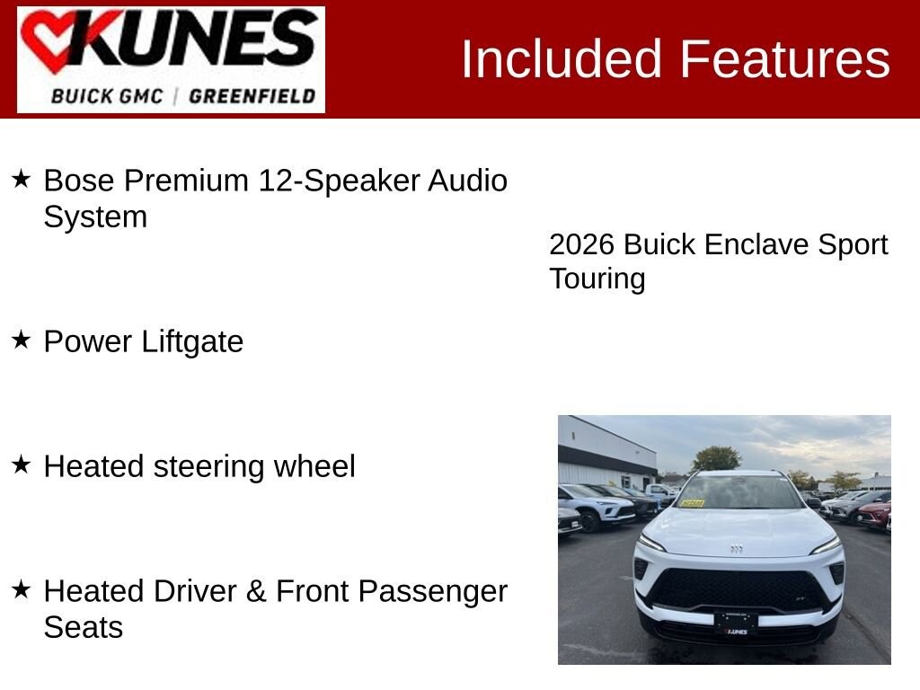 AWD, Bose Premium 12-Speaker Audio System, Heated Driver & Front Passenger Seats, Heated steering wheel, Power Liftgate. Summit White 2026 Buick Enclave Sport Touring AWD 8-Speed Automatic 2.5L DOHC