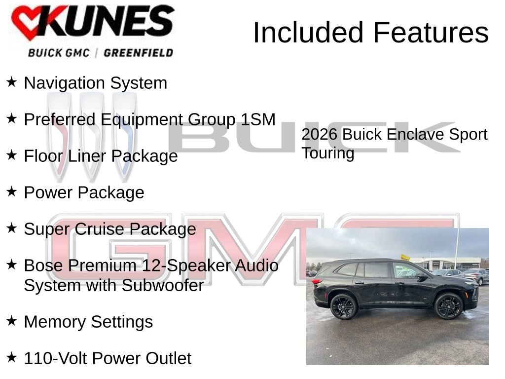 AWD, 110-Volt Power Outlet, 1st and 2nd Row All-Weather Floor Liners, 22 High Gloss Black Wheels, 2nd Row 1-Touch Flat Folding Seat, 3 Years OnStar One, 3rd Row 60/40 Power Split-Folding Bench Seat, 3rd Row All-Weather Floor Liner, Apple CarPlay/Android Auto, Auto High-beam Headlights, Black Lug Nuts and Wheel Lock Kit, Bose Premium 12-Speaker Audio System with Subwoofer, Driver Attention Assist, Enhanced Automatic Parking Assist, Floor Liner Package, Head-Up Display, Heated Driver and Front Passenger Seats, Heated steering wheel, Heated Wiper Park, Inside Rearview Auo-Dimming Rear Camera Mirror, Integrated Cargo Liner, Memory Settings, Navigation System, Power Liftgate, Power Package, Power Panoramic Sunroof with Sunshade, Preferred Equipment Group 1SM, Super Cruise, Super Cruise Package, Universal Home Remote, Wheels: 22 Transit. Ebony Twilight Metallic 2026 Buick Enclave Sport Touring AWD 8-Speed Automatic 2.5L DOHC