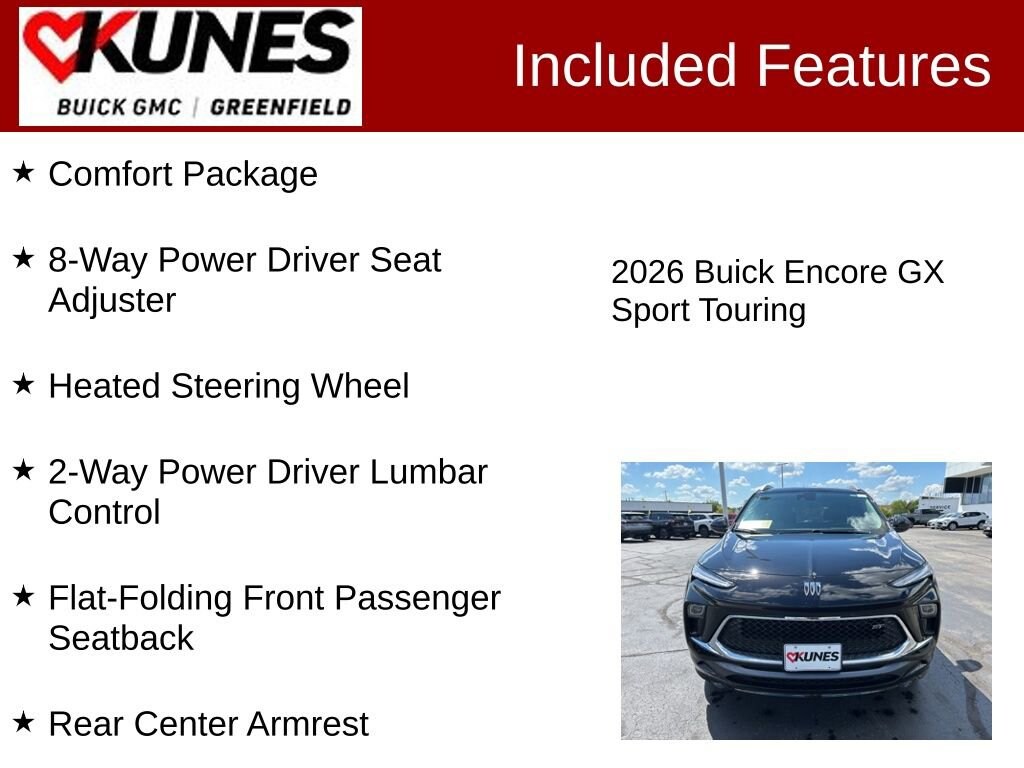 2-Way Power Driver Lumbar Control, 8-Way Power Driver Seat Adjuster, Comfort Package, Flat-Folding Front Passenger Seatback, Heated Driver & Front Passenger Seats, Heated Steering Wheel, Rear Center Armrest. Ebony Twilight Metallic 2026 Buick Encore GX Sport Touring AWD 9-Speed Automatic 26/28 City/Highway MPG ECOTEC 1.3L Turbo