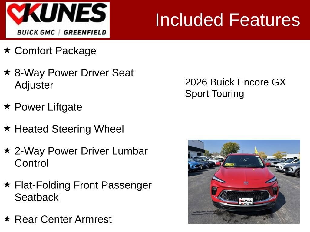 2-Way Power Driver Lumbar Control, 8-Way Power Driver Seat Adjuster, Comfort Package, Flat-Folding Front Passenger Seatback, Heated Driver & Front Passenger Seats, Heated Steering Wheel, Power Liftgate, Rear Center Armrest. Brilliant Red 2026 Buick Encore GX Sport Touring AWD 9-Speed Automatic 26/28 City/Highway MPG ECOTEC 1.3L Turbo