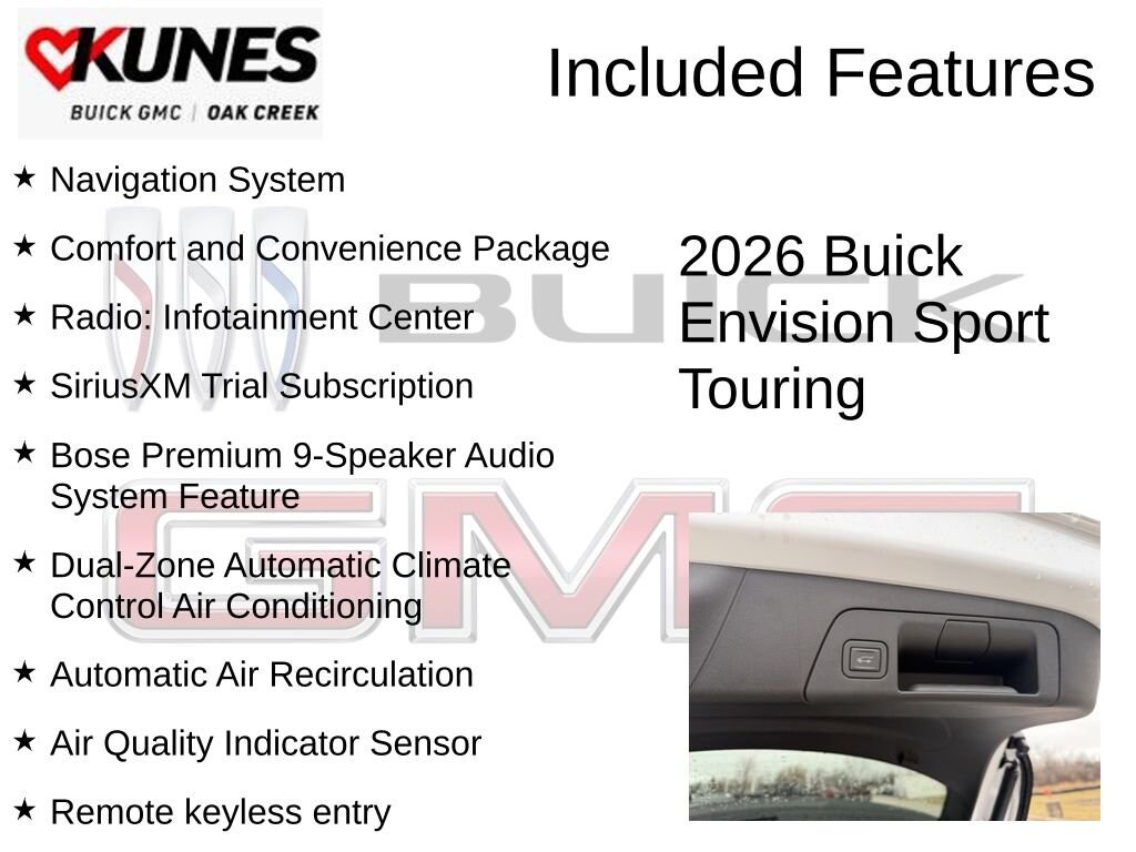 Summit White 2026 Buick Envision Sport Touring AWD 9-Speed Automatic 2.0L Turbocharged 3-Channel Programmable Universal Home Remote, 30 Diagonal LCD Display, Air Quality Indicator Sensor, Automatic Air Recirculation, Bose Premium 9-Speaker Audio System Feature, Comfort and Convenience Package, Dual-Zone Automatic Climate Control Air Conditioning, Hands-Free Power Programmable Liftgate, Heated Driver and Front Passenger Seats, Heated Steering Wheel, Navigation System, Perforated Leather-Appointed Seat Trim, Power Liftgate, Power Panoramic Tilt-Sliding Moonroof, Radio: Infotainment Center, Remote keyless entry, SiriusXM Trial Subscription, Wireless Apple CarPlay/Wireless Android Auto.