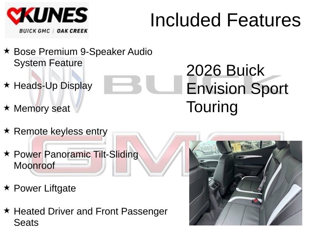 Ebony Twilight Metallic 2026 Buick Envision Sport Touring AWD 9-Speed Automatic 2.0L Turbocharged Bose Premium 9-Speaker Audio System Feature, Heads-Up Display, Heated Driver and Front Passenger Seats, Memory seat, Power Liftgate, Power Panoramic Tilt-Sliding Moonroof, Remote keyless entry.22/28 City/Highway MPGAlso included with every new vehicle we sell: LIFETIME NO FEAR WARRANTY, FIRST OIL CHANGE, and AT HOME COURTESY DELIVERY! Call us for full details! We pride ourselves on honesty and integrity, but please note that mistakes or misprints due to human error are possible. Find out why our dealerships have won DealerRater.com DEALER OF THE YEAR a whopping 10 TIMES! Call, email, or live chat with one of our friendly sales professionals now to schedule your test drive! Prices shown do not include tax, title, registration and $599 service fees. Price includes: $500 - Buick GMC Bonus Cash. Exp. 03/31/2026