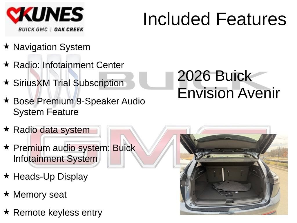 Quartz Blue Metallic 2026 Buick Envision Avenir AWD 9-Speed Automatic 2.0L Turbocharged 30 Diagonal LCD Display, Bose Premium 9-Speaker Audio System Feature, Heads-Up Display, Heated Driver and Front Passenger Seats, Heated steering wheel, Memory seat, Navigation System, Power Liftgate, Power moonroof, Premium audio system: Buick Infotainment System, Quilted and Perforated Leather-Appointed Seat Trim, Radio data system, Radio: Infotainment Center, Remote keyless entry, SiriusXM Trial Subscription, Ventilated Driver and Front Passenger Seats, Wireless Apple CarPlay/Wireless Android Auto.