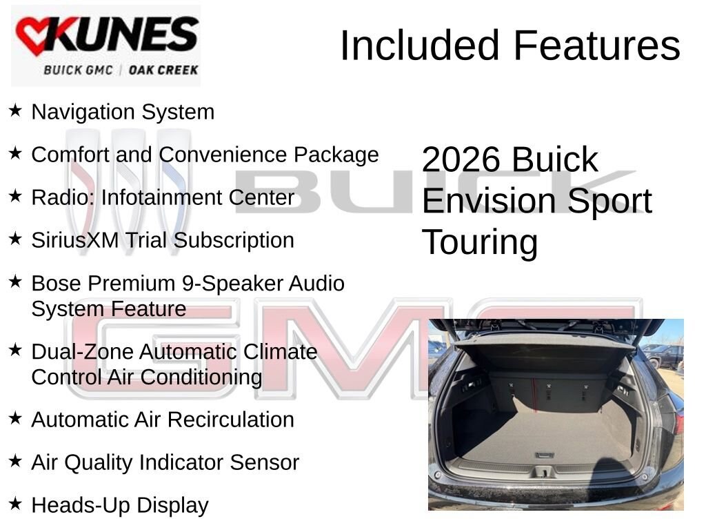 Ebony Twilight Metallic 2026 Buick Envision Sport Touring AWD 9-Speed Automatic 2.0L Turbocharged 3-Channel Programmable Universal Home Remote, 30 Diagonal LCD Display, Air Quality Indicator Sensor, Automatic Air Recirculation, Bose Premium 9-Speaker Audio System Feature, Comfort and Convenience Package, Dual-Zone Automatic Climate Control Air Conditioning, Hands-Free Power Programmable Liftgate, Heads-Up Display, Heated Driver and Front Passenger Seats, Heated Steering Wheel, Navigation System, Perforated Leather-Appointed Seat Trim, Power Liftgate, Power Panoramic Tilt-Sliding Moonroof, Radio: Infotainment Center, Remote keyless entry, SiriusXM Trial Subscription, Wireless Apple CarPlay/Wireless Android Auto.