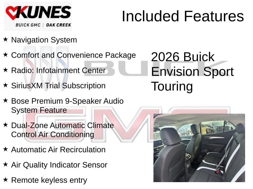 Brilliant Red 2026 Buick Envision Sport Touring AWD 9-Speed Automatic 2.0L Turbocharged 3-Channel Programmable Universal Home Remote, 30 Diagonal LCD Display, Air Quality Indicator Sensor, Automatic Air Recirculation, Bose Premium 9-Speaker Audio System Feature, Comfort and Convenience Package, Dual-Zone Automatic Climate Control Air Conditioning, Hands-Free Power Programmable Liftgate, Heated Driver and Front Passenger Seats, Heated Steering Wheel, Navigation System, Perforated Leather-Appointed Seat Trim, Power Liftgate, Power Panoramic Tilt-Sliding Moonroof, Radio: Infotainment Center, Remote keyless entry, SiriusXM Trial Subscription, Wireless Apple CarPlay/Wireless Android Auto.