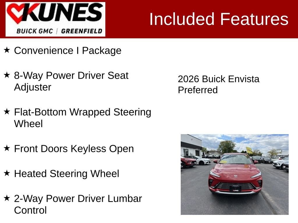2-Way Power Driver Lumbar Control, 8-Way Power Driver Seat Adjuster, Convenience I Package, Flat-Bottom Wrapped Steering Wheel, Front Doors Keyless Open, Heated Driver & Front Passenger Seats, Heated Steering Wheel. Brilliant Red 2026 Buick Envista Preferred FWD 6-Speed Automatic 28/32 City/Highway MPG ECOTEC 1.2L Turbo