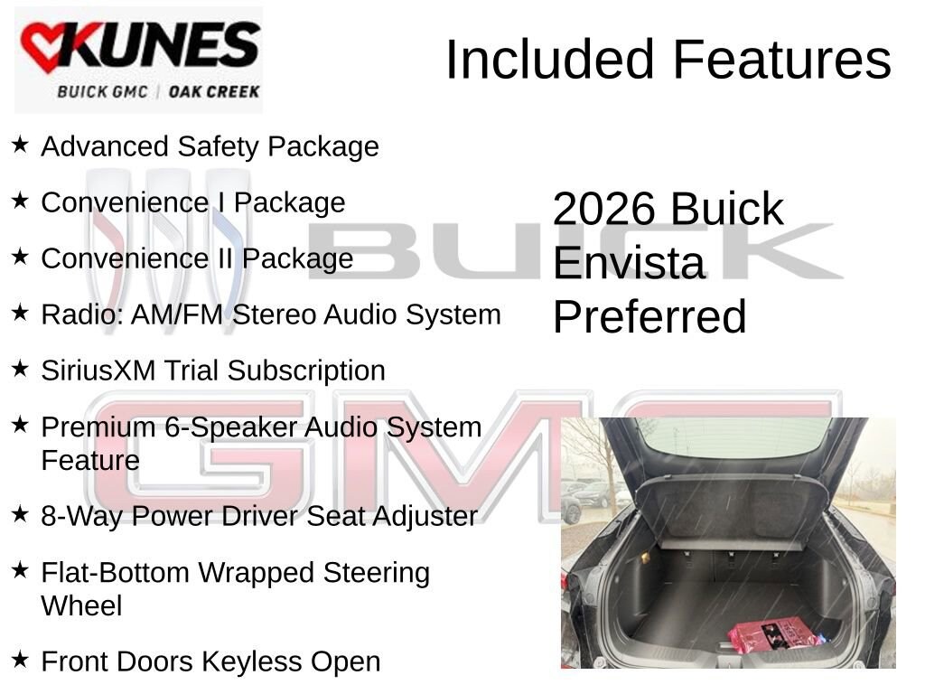 Ebony Twilight Metallic 2026 Buick Envista Preferred FWD 6-Speed Automatic ECOTEC 1.2L Turbo 2 USB Ports (1 Type-A, 1 Type-C), 2-Way Power Driver Lumbar Control, 8-Way Power Driver Seat Adjuster, Adaptive Cruise Control, Advanced Safety Package, Convenience I Package, Convenience II Package, Exterior Parking Camera Rear, Flat-Bottom Wrapped Steering Wheel, Front Doors Keyless Open, Front Intermittent Rainsense Wipers, Heated Driver and Front Passenger Seats, Heated Steering Wheel, Lane Change Alert with Side Blind Zone Alert, Power Liftgate, Premium 6-Speaker Audio System Feature, Radio: AM/FM Stereo Audio System, Rear Cross Traffic Alert, Rear Parking Sensors, SiriusXM Trial Subscription, Wireless Apple CarPlay/Wireless Android Auto, Wireless Charging.28/32 City/Highway MPGAlso included with every new vehicle we sell: LIFETIME NO FEAR WARRANTY, FIRST OIL CHANGE, and AT HOME COURTESY DELIVERY! Call us for full details! We pride ourselves on honesty and integrity, but please note that mistakes or misprints due to human error are possible. Find out why our dealerships have won DealerRater.com DEALER OF THE YEAR a whopping 10 TIMES! Call, email, or live chat with one of our friendly sales professionals now to schedule your test drive! Prices shown do not include tax, title, registration and $599 service fees. Price includes: $750 - Buick GMC Bonus Cash. Exp. 04/30/2026