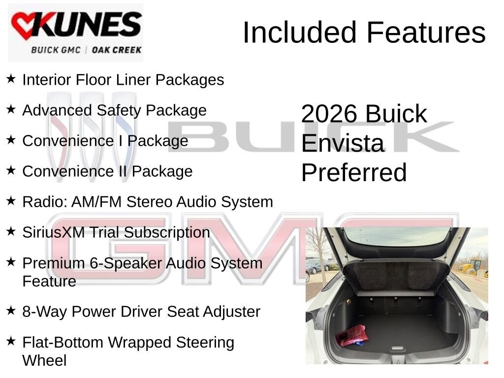 Summit White 2026 Buick Envista Preferred FWD 6-Speed Automatic ECOTEC 1.2L Turbo 2 USB Ports (1 Type-A, 1 Type-C), 2-Way Power Driver Lumbar Control, 8-Way Power Driver Seat Adjuster, Adaptive Cruise Control, Advanced Safety Package, All-Weather Floor Liners, Cargo Liner, Convenience I Package, Convenience II Package, Exterior Parking Camera Rear, Flat-Bottom Wrapped Steering Wheel, Front Doors Keyless Open, Front Intermittent Rainsense Wipers, Heated Driver and Front Passenger Seats, Heated Steering Wheel, Interior Floor Liner Packages, Lane Change Alert with Side Blind Zone Alert, Power Liftgate, Premium 6-Speaker Audio System Feature, Radio: AM/FM Stereo Audio System, Rear Cross Traffic Alert, Rear Parking Sensors, SiriusXM Trial Subscription, Wireless Apple CarPlay/Wireless Android Auto, Wireless Charging.28/32 City/Highway MPGAlso included with every new vehicle we sell: LIFETIME NO FEAR WARRANTY, FIRST OIL CHANGE, and AT HOME COURTESY DELIVERY! Call us for full details! We pride ourselves on honesty and integrity, but please note that mistakes or misprints due to human error are possible. Find out why our dealerships have won DealerRater.com DEALER OF THE YEAR a whopping 10 TIMES! Call, email, or live chat with one of our friendly sales professionals now to schedule your test drive! Prices shown do not include tax, title, registration and $599 service fees. Price includes: $750 - Buick GMC Bonus Cash. Exp. 04/30/2026