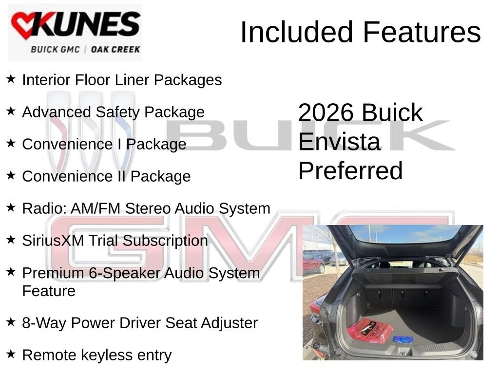 Ebony Twilight Metallic 2026 Buick Envista Preferred FWD 6-Speed Automatic ECOTEC 1.2L Turbo 2 USB Ports (1 Type-A, 1 Type-C), 2-Way Power Driver Lumbar Control, 8-Way Power Driver Seat Adjuster, Adaptive Cruise Control, Advanced Safety Package, All-Weather Floor Liners, Cargo Liner, Convenience I Package, Convenience II Package, Exterior Parking Camera Rear, Flat-Bottom Wrapped Steering Wheel, Front Doors Keyless Open, Front Intermittent Rainsense Wipers, Heated Driver and Front Passenger Seats, Heated Steering Wheel, Interior Floor Liner Packages, Lane Change Alert with Side Blind Zone Alert, Power Liftgate, Premium 6-Speaker Audio System Feature, Radio: AM/FM Stereo Audio System, Rear Cross Traffic Alert, Rear Parking Sensors, Remote keyless entry, SiriusXM Trial Subscription, Wireless Apple CarPlay/Wireless Android Auto, Wireless Charging.