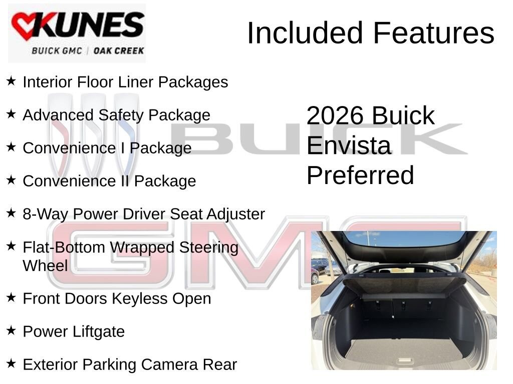 Summit White 2026 Buick Envista Preferred FWD 6-Speed Automatic ECOTEC 1.2L Turbo 2-Way Power Driver Lumbar Control, 8-Way Power Driver Seat Adjuster, Adaptive Cruise Control, Advanced Safety Package, All-Weather Floor Liners, Cargo Liner, Convenience I Package, Convenience II Package, Exterior Parking Camera Rear, Flat-Bottom Wrapped Steering Wheel, Front Doors Keyless Open, Front Intermittent Rainsense Wipers, Heated Driver and Front Passenger Seats, Heated Steering Wheel, Interior Floor Liner Packages, Lane Change Alert with Side Blind Zone Alert, Power Liftgate, Rear Cross Traffic Alert, Rear Parking Sensors, Wireless Charging.