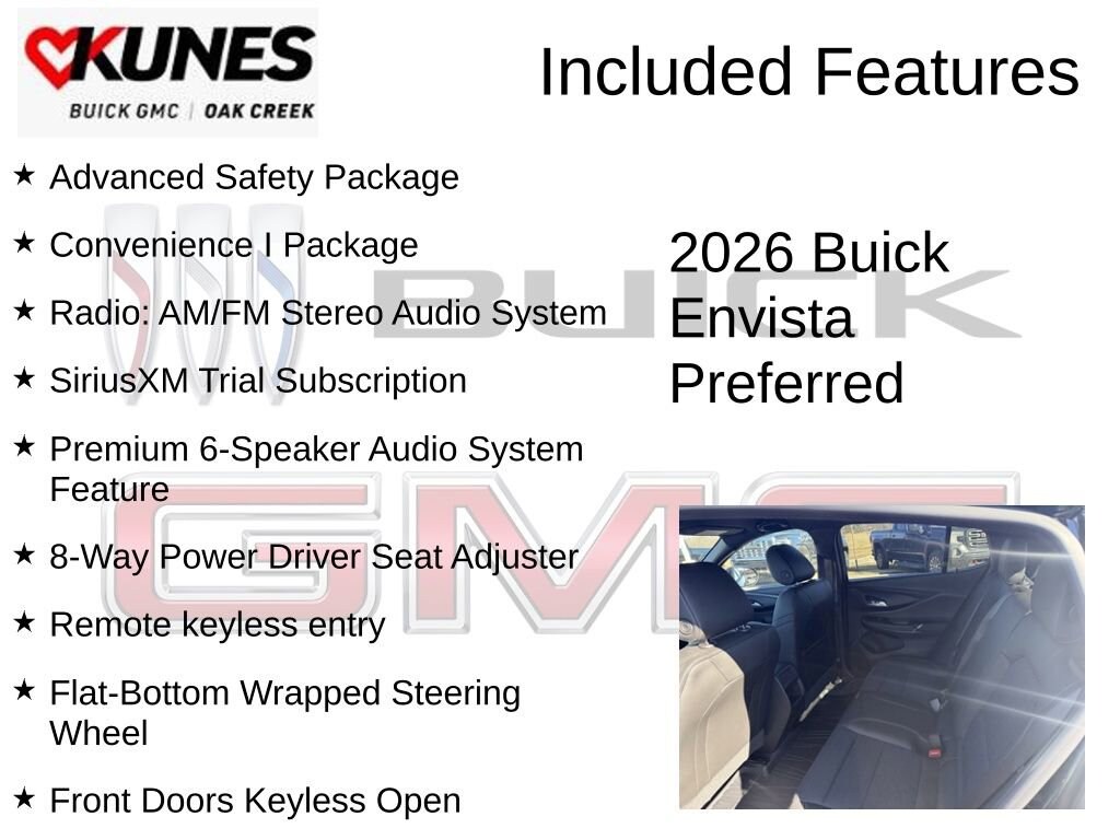 Ebony Twilight Metallic 2026 Buick Envista Preferred FWD 6-Speed Automatic ECOTEC 1.2L Turbo 2 USB Ports (1 Type-A, 1 Type-C), 2-Way Power Driver Lumbar Control, 8-Way Power Driver Seat Adjuster, Adaptive Cruise Control, Advanced Safety Package, Convenience I Package, Flat-Bottom Wrapped Steering Wheel, Front Doors Keyless Open, Heated Driver and Front Passenger Seats, Heated Steering Wheel, Lane Change Alert with Side Blind Zone Alert, Premium 6-Speaker Audio System Feature, Radio: AM/FM Stereo Audio System, Rear Cross Traffic Alert, Rear Parking Sensors, Remote keyless entry, SiriusXM Trial Subscription, Wheels: 17 Bright Silver Painted Aluminum, Wireless Apple CarPlay/Wireless Android Auto.