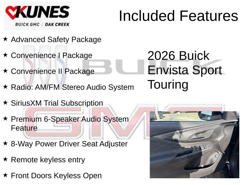 Ebony Twilight Metallic 2026 Buick Envista Sport Touring FWD 6-Speed Automatic ECOTEC 1.2L Turbo 2 USB Ports (1 Type-A, 1 Type-C), 2-Way Power Driver Lumbar Control, 8-Way Power Driver Seat Adjuster, Adaptive Cruise Control, Advanced Safety Package, Convenience I Package, Convenience II Package, Front Doors Keyless Open, Front Intermittent Rainsense Wipers, Heated Driver and Front Passenger Seats, Heated Steering Wheel, Lane Change Alert with Side Blind Zone Alert, Leatherette Seat Trim, Power Liftgate, Premium 6-Speaker Audio System Feature, Radio: AM/FM Stereo Audio System, Rear Cross Traffic Alert, Rear Parking Sensors, Remote keyless entry, SiriusXM Trial Subscription, Wheels: 18 Black Painted Aluminum, Wireless Apple CarPlay/Wireless Android Auto, Wireless Charging.