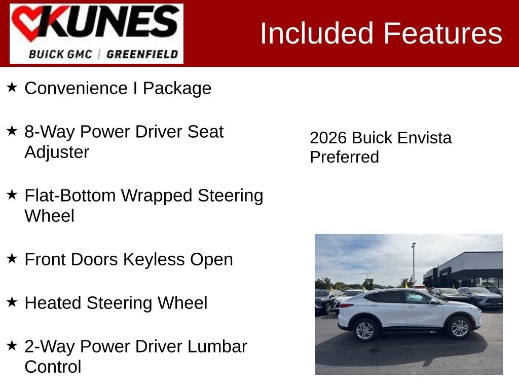 2-Way Power Driver Lumbar Control, 8-Way Power Driver Seat Adjuster, Convenience I Package, Flat-Bottom Wrapped Steering Wheel, Front Doors Keyless Open, Heated Driver & Front Passenger Seats, Heated Steering Wheel. Summit White 2026 Buick Envista Preferred FWD 6-Speed Automatic 28/32 City/Highway MPG ECOTEC 1.2L Turbo