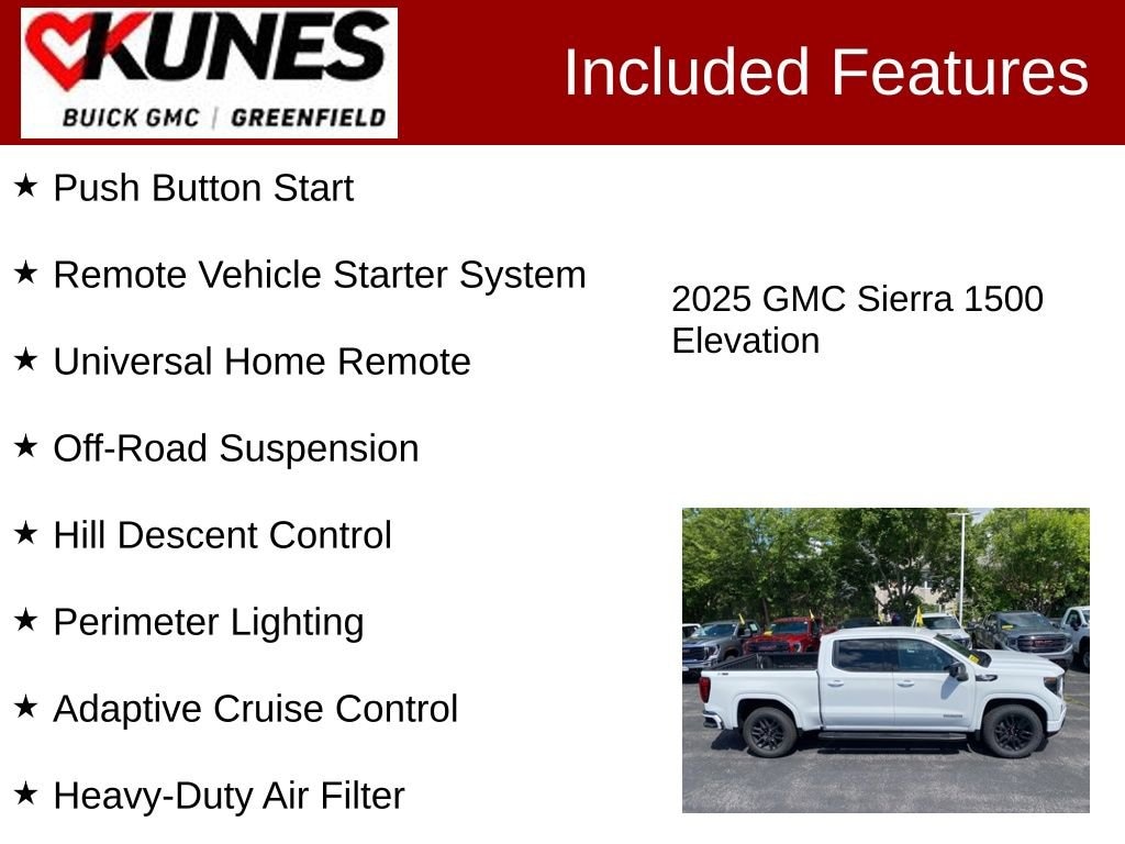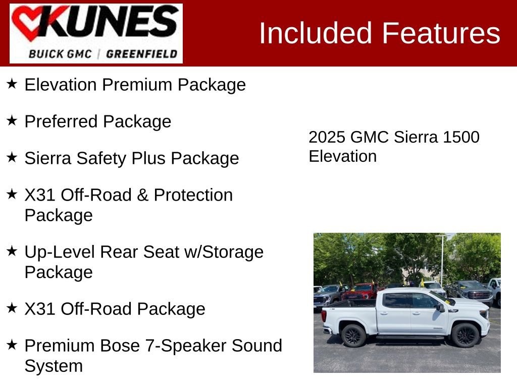 10-Speed Automatic, 4WD, Black Leather, Adaptive Cruise Control, All-Weather Floor Liner (LPO), Dual Exhaust System, Elevation Premium Package, HD Surround Vision, Heated Driver & Front Outboard Passenger Seating, Heated steering wheel, Heavy-Duty Air Filter, High Gloss Black Mirror Caps, Hill Descent Control, Hitch View, In-Vehicle Trailering System App, Leather-Appointed Seat Trim, Off-Road Suspension, Perimeter Lighting, Power Sliding Rear Window w/Rear Defogger, Preferred Package, Premium Bose 7-Speaker Sound System, Push Button Start, Rear Cross Traffic Braking, Rear Pedestrian Detection, Rear Wheelhouse Liners, Remote Vehicle Starter System, Sierra Safety Plus Package, Spray-On Pickup Bedliner w/GMC Logo, Trailer Camera Provisions, Trailer Side Blind Zone Alert, Ultrasonic Front & Rear Park Assist, Universal Home Remote, Up-Level Rear Seat w/Storage Package, X31 Hard Badge, X31 Off-Road & Protection Package, X31 Off-Road Package. Summit White 2025 GMC Sierra 1500 Elevation 4WD 10-Speed Automatic 15/19 City/Highway MPG EcoTec3 5.3L V8