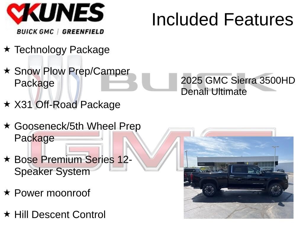 10-Speed Automatic, 4WD, Alpine Umber Leather, 16-Way Power Driver Seat Adjuster w/Lumbar, 16-Way Power Passenger Seat Adjuster w/Lumbar, 220 Amp Alternator, Auto-Dimming Inside Rearview Mirror w/Camera, Bose Premium Series 12-Speaker System, Full Grain Leather Seat Trim, Garage door transmitter, Genuine wood dashboard insert, Genuine wood door panel insert, GMC Premium 13.4 Diagonal Information Display, Gooseneck/5th Wheel Prep Package, HD Surround Vision, Heated Driver & Front Outboard Passenger Seats, Heated steering wheel, Hill Descent Control, IntelliBeam Automatic High Beam On/Off, Multicolor 15 Diagonal Head-Up Display, Power moonroof, Rain sensing wipers, Snow Plow Prep/Camper Package, Spray-On Pickup Bedliner w/GMC Logo, Technology Package, Ventilated Driver & Front Passenger Seats, X31 Off-Road Package. Onyx Black 2025 GMC Sierra 3500HD Denali Ultimate 4WD 10-Speed Automatic Duramax 6.6L V8 Turbodiesel