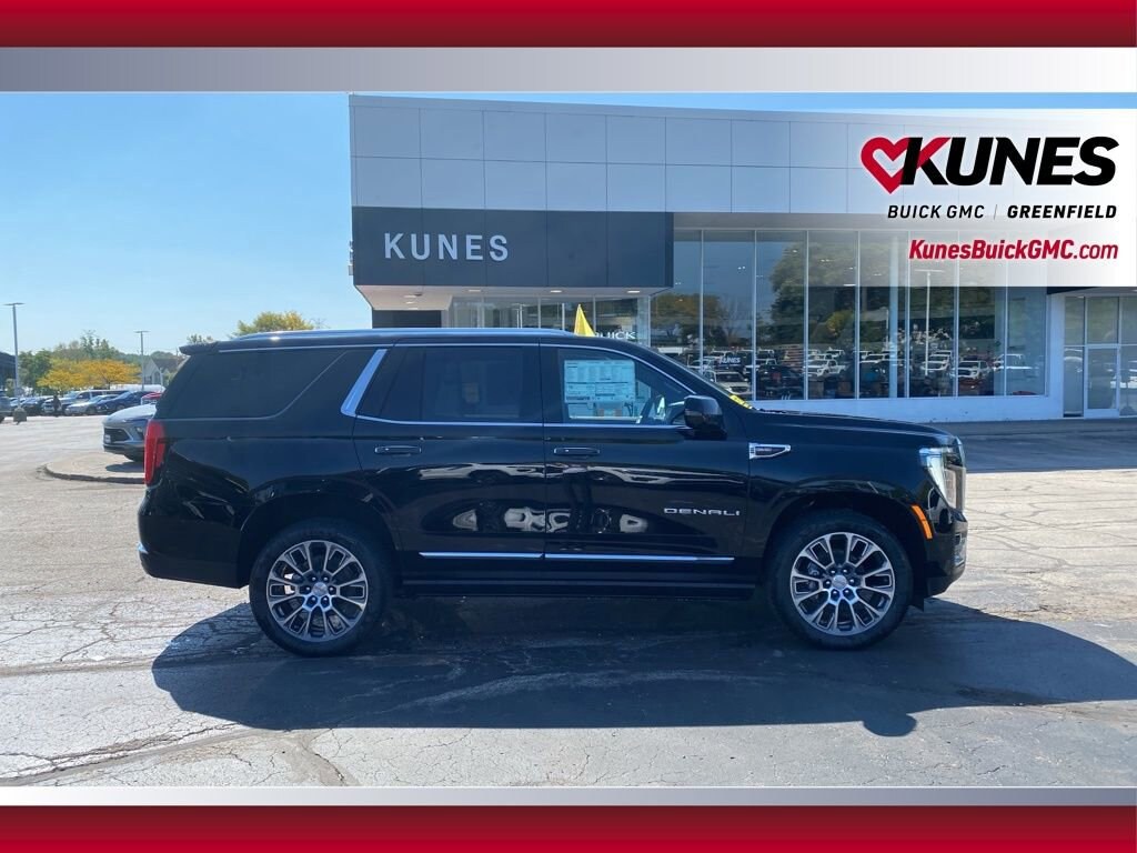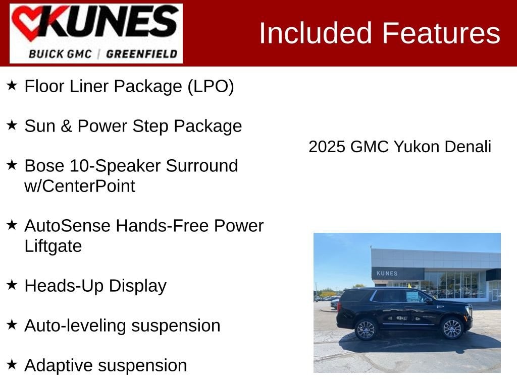 4WD, 1st & 2nd Rows Premium Floor Liners (LPO), 3rd Row All-Weather Floor Liners (LPO), Adaptive suspension, All-Weather Cargo Mat (LPO), Auto-leveling suspension, AutoSense Hands-Free Power Liftgate, Bose 10-Speaker Surround w/CenterPoint, Dual Exhaust System, Dual-Pane Panoramic Power Sunroof, Floor Liner Package (LPO), Galvano Bodyside Moldings, Heads-Up Display, Heated steering wheel, Perforated Heated & Ventilated Dr & Frt Pass Seats, Power Liftgate, Power-Retractable Assist Steps, Rain sensing wipers, Sun & Power Step Package. Onyx Black 2025 GMC Yukon Denali 4WD 10-Speed Automatic with Overdrive 14/18 City/Highway MPG EcoTec3 6.2L V8