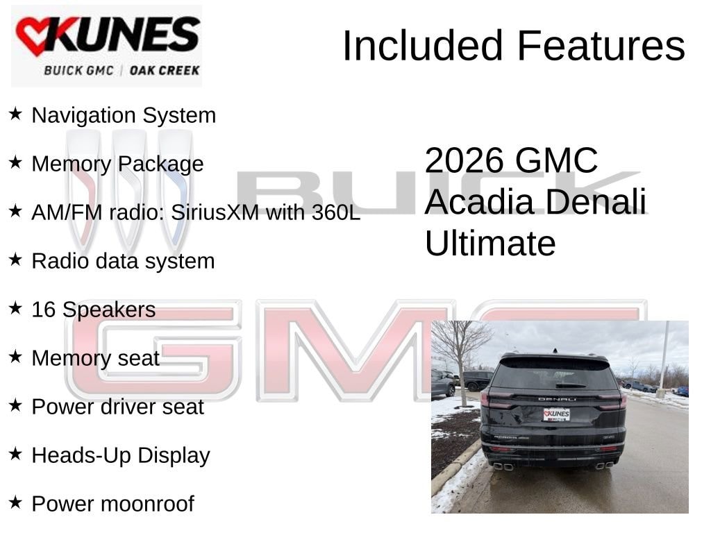 Ebony Twilight Metallic 2026 GMC Acadia Denali Ultimate AWD 8-Speed Automatic 2.5L DOHC AWD, Woodland Mahogany Leather, 16 Speakers, AM/FM radio: SiriusXM with 360L, Heads-Up Display, Heated front seats, Heated steering wheel, Memory Package, Memory seat, Navigation System, Power driver seat, Power Liftgate, Power moonroof, Radio data system, Rain sensing wipers, Wheels: 22 x 8.5 After Midnight Machined Aluminum.Recent Arrival!Also included with every new vehicle we sell: LIFETIME NO FEAR WARRANTY, FIRST OIL CHANGE, and AT HOME COURTESY DELIVERY! Call us for full details! We pride ourselves on honesty and integrity, but please note that mistakes or misprints due to human error are possible. Find out why our dealerships have won DealerRater.com DEALER OF THE YEAR a whopping 10 TIMES! Call, email, or live chat with one of our friendly sales professionals now to schedule your test drive! Prices shown do not include tax, title, registration and $599 service fees.