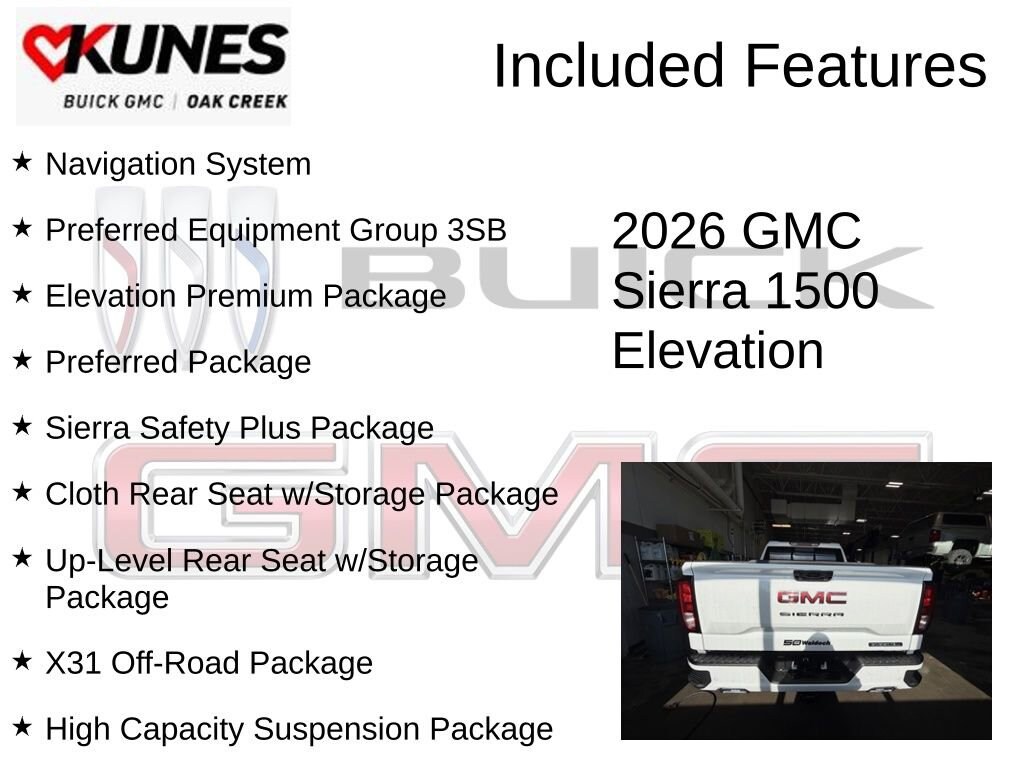 Summit White 2026 GMC Sierra 1500 Elevation 4WD 10-Speed Automatic EcoTec3 5.3L V8 10-Speed Automatic, 4WD, Black Leather, 120-Volt Bed Mounted Power Outlet, 120-Volt Interior Power Outlet, 2 Charge/Data USB Ports, 2 Type-C Charge-Only Rear USB Ports, 6-Speaker Audio System Feature, 6 Rectangular Black Tubular Assist Steps (LPO), Adaptive Cruise Control, All-Weather Floor Liner (LPO), Auto-Locking Rear Differential, Body Color Header w/Gloss Black Mesh Grille Bars, Cloth Rear Seat w/Storage Package, Color-Keyed Carpeting Floor Covering, Deep-Tinted Glass, Dual Exhaust System, Electric Rear-Window Defogger, Elevation Premium Package, Front Frame-Mounted Black Recovery Hooks, Front Rubberized-Vinyl Floor Mats, HD Rear Vision Camera, HD Surround Vision, Heavy-Duty Air Filter, High Capacity Suspension Package, High Gloss Black Mirror Caps, Hill Descent Control, Hitch Guidance, Hitch View, In-Vehicle Trailering System App, Integrated Trailer Brake Controller, Leather-Appointed Seat Trim, LED Cargo Area Lighting, Navigation System, Off-Road Suspension, OnStar Services Capable, Perimeter Lighting, Power Door Locks, Power Front Windows w/Driver Express Up/Down, Power Front Windows w/Passenger Express Down, Preferred Equipment Group 3SB, Preferred Package, Premium Bose 7-Speaker Sound System, Push Button Start, Rear Cross Traffic Braking, Rear Pedestrian Detection, Rear Rubberized-Vinyl Floor Mats, Rear Wheelhouse Liners, Remote Vehicle Starter System, Sierra Safety Plus Package, Steering Wheel Audio Controls, Theft Deterrent System (Unauthorized Entry), Trailer Camera Provisions, Trailer Side Blind Zone Alert, Trailering Package, Ultrasonic Front & Rear Park Assist, Universal Home Remote, Up-Level Rear Seat w/Storage Package, Wi-Fi Hotspot Capable, X31 Hard Badge, X31 Off-Road Package.