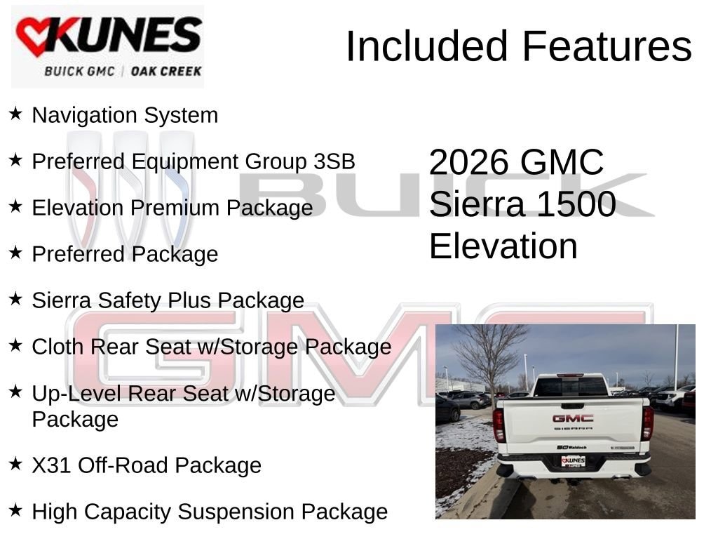 Summit White 2026 GMC Sierra 1500 Elevation 4WD 10-Speed Automatic EcoTec3 5.3L V8 10-Speed Automatic, 4WD, Black Leather, 120-Volt Bed Mounted Power Outlet, 120-Volt Interior Power Outlet, 2 Charge/Data USB Ports, 2 Type-C Charge-Only Rear USB Ports, 6-Speaker Audio System Feature, 6 Rectangular Black Tubular Assist Steps (LPO), Adaptive Cruise Control, All-Weather Floor Liner (LPO), Auto-Locking Rear Differential, Body Color Header w/Gloss Black Mesh Grille Bars, Cloth Rear Seat w/Storage Package, Color-Keyed Carpeting Floor Covering, Deep-Tinted Glass, Dual Exhaust System, Electric Rear-Window Defogger, Elevation Premium Package, Front Frame-Mounted Black Recovery Hooks, Front Rubberized-Vinyl Floor Mats, HD Rear Vision Camera, HD Surround Vision, Heavy-Duty Air Filter, High Capacity Suspension Package, High Gloss Black Mirror Caps, Hill Descent Control, Hitch Guidance, Hitch View, In-Vehicle Trailering System App, Integrated Trailer Brake Controller, Keyless Open & Start, Leather-Appointed Seat Trim, LED Cargo Area Lighting, Manual Tilt-Wheel & Telescoping Steering Column, Navigation System, Off-Road Suspension, OnStar Services Capable, Perimeter Lighting, Power Door Locks, Power Front Windows w/Driver Express Up/Down, Power Front Windows w/Passenger Express Down, Power Rear Windows w/Express Down, Power Sliding Rear Window w/Rear Defogger, Preferred Equipment Group 3SB, Preferred Package, Premium Bose 7-Speaker Sound System, Push Button Start, Rear Cross Traffic Braking, Rear Pedestrian Detection, Rear Rubberized-Vinyl Floor Mats, Rear Wheelhouse Liners, Remote Vehicle Starter System, Sierra Safety Plus Package, SiriusXM w/360L Trial Subscription, Spray-On Pickup Bedliner w/GMC Logo, Steering Wheel Audio Controls, Theft Deterrent System (Unauthorized Entry), Trailer Camera Provisions, Trailer Side Blind Zone Alert, Trailering Package, Ultrasonic Front & Rear Park Assist, Universal Home Remote, Up-Level Rear Seat w/Storage Package, Wi-Fi Hotspot Capable, X31 Hard Badge, X31 Off-Road Package.Recent Arrival!Also included with every new vehicle we sell: LIFETIME NO FEAR WARRANTY, FIRST OIL CHANGE, and AT HOME COURTESY DELIVERY! Call us for full details! We pride ourselves on honesty and integrity, but please note that mistakes or misprints due to human error are possible. Find out why our dealerships have won DealerRater.com DEALER OF THE YEAR a whopping 10 TIMES! Call, email, or live chat with one of our friendly sales professionals now to schedule your test drive! Prices shown do not include tax, title, registration and $599 service fees. Price includes: $1500 - GM Bonus Cash. Exp. 02/02/2026 $1750 - Buick & GMC Consumer Cash Program. Exp. 02/02/2026 Price Includes: $3000 - Kunes Special Offer or Conditional Trade In Program. Exp Exp. 02/02/2026