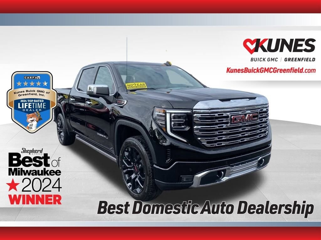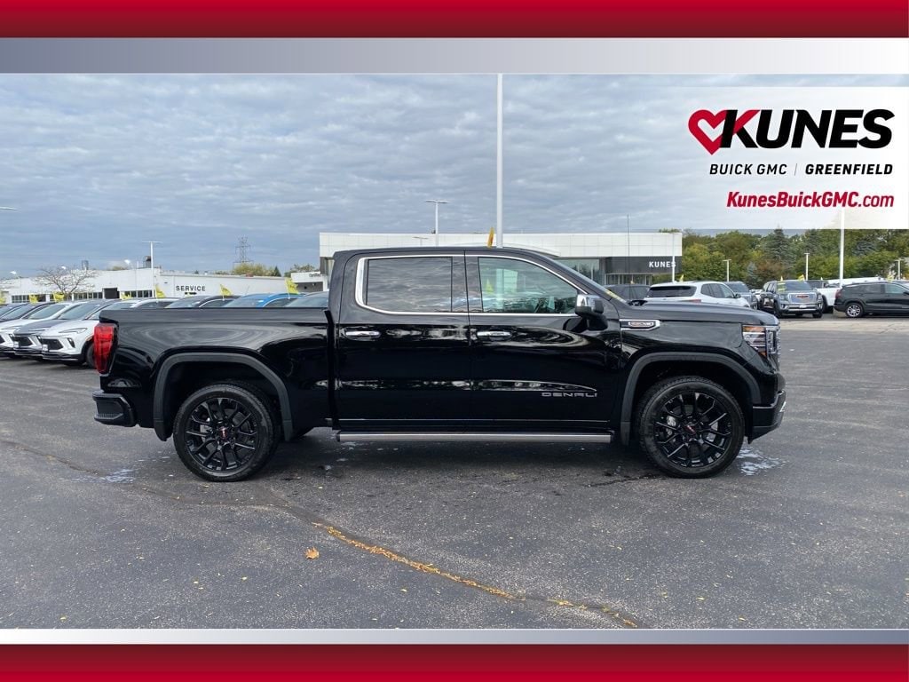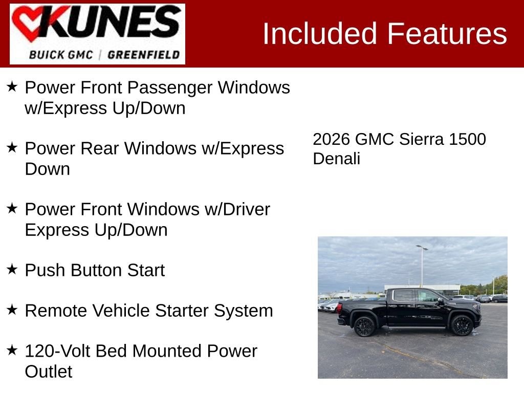 10-Speed Automatic, 4WD, Black Leather, 120-Volt Bed Mounted Power Outlet, 120-Volt Interior Power Outlet, 170 Amp Alternator, 2 Charge/Data USB Ports Inside Center Console, 2 Type-C Charge-Only Rear USB Ports, 2 USB Ports, Auto-Locking Rear Differential, Auxiliary External Transmission Oil Cooler, Bed View Camera, Chrome Header w/Signature Denali Chrome Grille, Chrome Recovery Hooks, Chrome Wheel To Wheel Assist Steps, Color-Keyed Carpeting Floor Covering, Deep-Tinted Glass, Denali Reserve Package, Electric Rear-Window Defogger, Floor-Mounted Center Console, Front Rain-Sensing Wipers, GMC MultiPro Power Steps, HD Surround Vision, Heated 2nd Row Outboard Seats, Heated Driver & Front Outboard Passenger Seating, Heated steering wheel, Heavy-Duty Air Filter, Hill Descent Control, Hitch Guidance, Hitch View, In-Vehicle Trailering System App, Integrated Trailer Brake Controller, Keyless Open & Start, LED Cargo Area Lighting, Multicolor 15 Diagonal Head-Up Display, OnStar Services Capable, Perimeter Lighting, Power Door Locks, Power Front Passenger Windows w/Express Up/Down, Power Front Windows w/Driver Express Up/Down, Power Rake & Telescoping Steering Column, Power Rear Windows w/Express Down, Power Sliding Rear Window w/Rear Defogger, Power Sunroof, Preferred Equipment Group 5SA, Premium Bose 7-Speaker Sound System, Push Button Start, Rain sensing wipers, Rear Camera Mirror, Rear Cross Traffic Braking, Rear Pedestrian Detection, Rear Wheelhouse Liners, Remote Vehicle Starter System, SiriusXM w/360L Trial Subscription, Spray-On Pickup Bedliner w/GMC Logo, Steering Wheel Audio Controls, Technology Package, Theft Deterrent System (Unauthorized Entry), Trailer Camera Provisions, Trailer Side Blind Zone Alert, Trailering Package, Ultrasonic Front & Rear Park Assist, Universal Home Remote, Ventilated Driver & Front Passenger Seats, Wheel Locks (Set of 4) (LPO), Wheels: 22 x 9 Painted Aluminum, Wi-Fi Hotspot Capable, Wireless Charging. Onyx Black 2026 GMC Sierra 1500 Denali 4WD 10-Speed Automatic 15/19 City/Highway MPG EcoTec3 6.2L V8