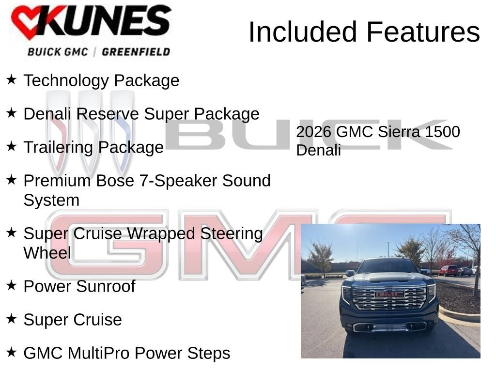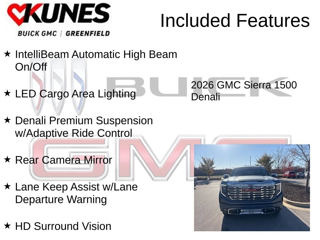10-Speed Automatic, 4WD, Jet Blk Forge Leather, Apple CarPlay/Android Auto, Denali Premium Suspension w/Adaptive Ride Control, Denali Reserve Super Package, Genuine wood console insert, Genuine wood dashboard insert, Genuine wood door panel insert, GMC MultiPro Power Steps, HD Surround Vision, Heated Driver & Front Outboard Passenger Seating, Heated steering wheel, Hitch Guidance, Illuminated entry, IntelliBeam Automatic High Beam On/Off, Lane Keep Assist w/Lane Departure Warning, LED Cargo Area Lighting, Multicolor 15 Diagonal Head-Up Display, Power Sunroof, Premium Bose 7-Speaker Sound System, Rain sensing wipers, Rear Camera Mirror, Super Cruise, Super Cruise Wrapped Steering Wheel, Technology Package, Trailering Package, Ventilated Driver & Front Passenger Seats, Wheel Locks (Set of 4) (LPO), Wheels: 22 x 9 Painted Aluminum. Downpour Met 2026 GMC Sierra 1500 Denali 4WD 10-Speed Automatic 15/19 City/Highway MPG EcoTec3 6.2L V8Also included with every new vehicle we sell: LIFETIME NO FEAR WARRANTY, FIRST OIL CHANGE, and AT HOME COURTESY DELIVERY! Call us for full details! We pride ourselves on honesty and integrity, but please note that mistakes or misprints due to human error are possible. Find out why our dealerships have won DealerRater.com DEALER OF THE YEAR a whopping 10 TIMES! Call, email, or live chat with one of our friendly sales professionals now to schedule your test drive! Prices shown do not include tax, title, registration and $499 service fees. Price includes:$1500 - Buick & GMC Consumer Cash Program $250 - December GMC Sales Event LD Bonus Cash $500 - GM Bonus Cash