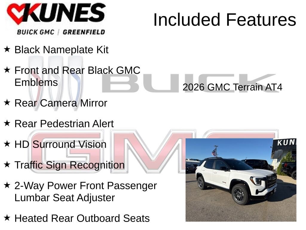 AWD, 2-Way Power Front Passenger Lumbar Seat Adjuster, 8-Way Power Passenger Seat Adjuster, Black Badging Package, Black Nameplate Kit, Convenience Package III, Front and Rear Black GMC Emblems, HD Surround Vision, Heated Rear Outboard Seats, Memory Package, Navigation System, Preferred Equipment Group 4SB, Rear Camera Mirror, Rear Camera Mirror Washer, Rear Pedestrian Alert, Technology Package II, Traffic Sign Recognition, Ventilated Driver Seat, Ventilated Front Passenger Seat. Summit White 2026 GMC Terrain AT4 AWD 8-Speed Automatic with Overdrive 24/26 City/Highway MPG 1.5L DOHCRecent Arrival! 24/26 City/Highway MPGAlso included with every new vehicle we sell: LIFETIME NO FEAR WARRANTY, FIRST OIL CHANGE, and AT HOME COURTESY DELIVERY! Call us for full details! We pride ourselves on honesty and integrity, but please note that mistakes or misprints due to human error are possible. Find out why our dealerships have won DealerRater.com DEALER OF THE YEAR a whopping 10 TIMES! Call, email, or live chat with one of our friendly sales professionals now to schedule your test drive! Prices shown do not include tax, title, registration and $499 service fees.
