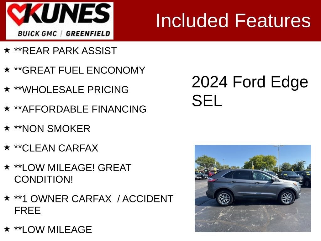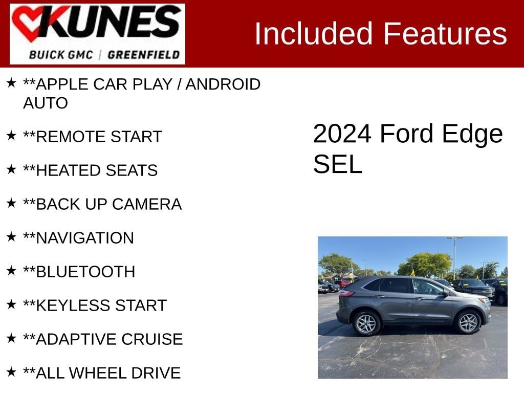 **APPLE CAR PLAY / ANDROID AUTO, **REMOTE START, **HEATED SEATS, **BACK UP CAMERA, **NAVIGATION, **BLUETOOTH, **KEYLESS START, **ADAPTIVE CRUISE, **ALL WHEEL DRIVE, **REAR PARK ASSIST, **GREAT FUEL ENCONOMY, **WHOLESALE PRICING, **AFFORDABLE FINANCING, **NON SMOKER, **CLEAN CARFAX, **LOW MILEAGE! GREAT CONDITION!, **1 OWNER CARFAX / ACCIDENT FREE, **LOW MILEAGE, **LANE DEPARTURE WARNING, **KEYLESS ENTRY, **BLIND SPOT MONITOR, AWD, Active Cruise Control. CARFAX One-Owner. Clean CARFAX. Certified. 21/28 City/Highway MPG Priced below KBB Fair Purchase Price!Gray Metallic 2024 Ford Edge SEL 4D Sport Utility AWD 8-Speed Automatic EcoBoost 2.0L I4 GTDi DOHC Turbocharged VCTCertification Program Details:** NO FEAR LIFETIME CERTIFIED PREOWNED **Over $2,895 of value at no cost!*LIFETIME WARRANTY!*3 Day Exchange Policy!*Complimentary powertrain warranty with ability to upgrade to fully comprehensive coverage and/or extend up to 125,000 miles!*125+ Point Inspection by our factory trained ASE Certified technicians and reconditioned to the highest standards.*Complimentary AutoCheck History Report*Complimentary AutoCheck Buyback Protection*Financing for Everyone - Guaranteed credit approval regardless of credit history!*Over 30 lenders who compete to get you the best financing terms*No payments for up to 90 days!*Weekly, Bi-Weekly, and Monthly Payment Options for all buyers!*First Free Oil Change!*Trade anytime policy - cars, trucks, boats, RVs, motorcycles - as long as we donât have to feed it, you can trade it!Find out why our dealerships have won DealerRater.com DEALER OF THE YEAR a whopping 10 TIMES! Call, email, or live chat with one of our friendly sales professionals now to schedule your test drive! Prices shown do not include tax, title, registration and $499 service fees.