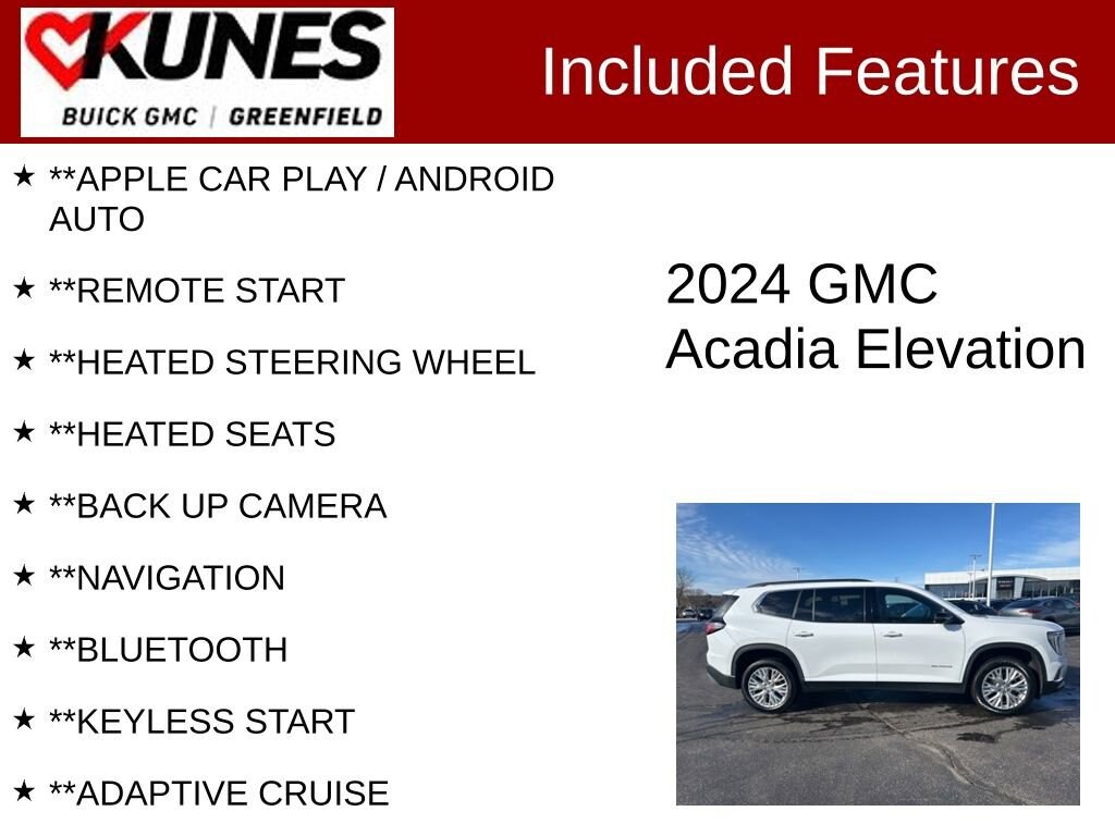Summit White 2024 GMC Acadia Elevation 4D Sport Utility AWD 8-Speed Automatic 2.5L DOHC