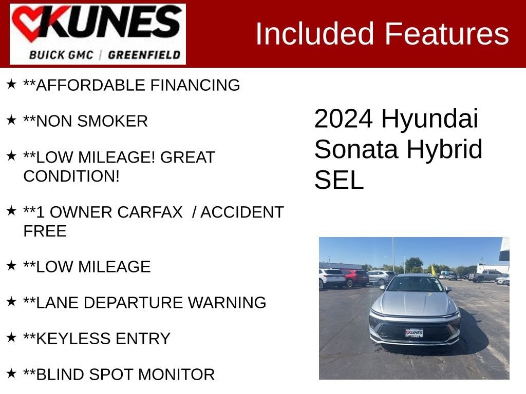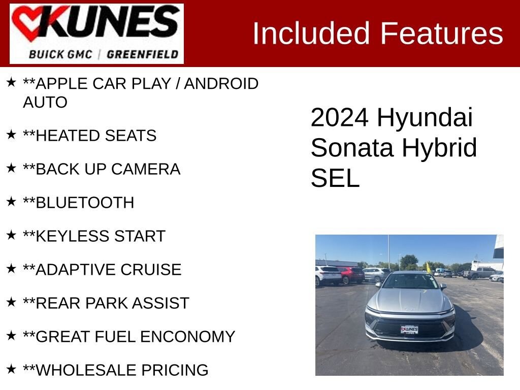 NO FEAR LIFETIME CERTIFIED PREOWNED **Over $2,895 of value at no cost!LIFETIME WARRANTY!3 Day Exchange Policy!Complimentary powertrain warranty with ability to upgrade to fully comprehensive coverage and/or extend up to 125,000 miles!125+ Point Inspection by our factory trained ASE Certified technicians and reconditioned to the highest standards.Complimentary AutoCheck History ReportComplimentary AutoCheck Buyback ProtectionFinancing for Everyone - Guaranteed credit approval regardless of credit history!Over 30 lenders who compete to get you the best financing termsNo payments for up to 90 days!Weekly, Bi-Weekly, and Monthly Payment Options for all buyers!First Free Oil Change!Trade anytime policy - cars, trucks, boats, RVs, motorcycles - as long as we don't have to feed it, you can trade it! 2024 Hyundai Sonata Hybrid SEL in Aero Silver with Dark Gray interior Adaptive Cruise Control with steering assist Heated front seats with power adjustment for driver and passenger Blind Spot Monitor with Lane Keeping Assist and Lane Departure Warning Front Collision Mitigation with multiple airbag protection system 2.0L I-4 Hybrid engine with 6-speed automatic transmission Android Auto, Apple CarPlay, and Bluetooth connectivity Smart device integration with telematics capabilities Hands-free power liftgate with remote trunk release Multi-zone air conditioning with climate control LED headlights, daytime running lights, and brakelights Front and rear performance tires with aluminum wheels Keyless entry and start with push-button ignition Back-up camera with rear parking assistance Premium audio system with steering wheel controls Power mirrors with heating function Traction control and stability management 13.2-gallon fuel tank capacity Front-wheel drive with 4-wheel disc brakes Auto engine stop-start feature for improved efficiency