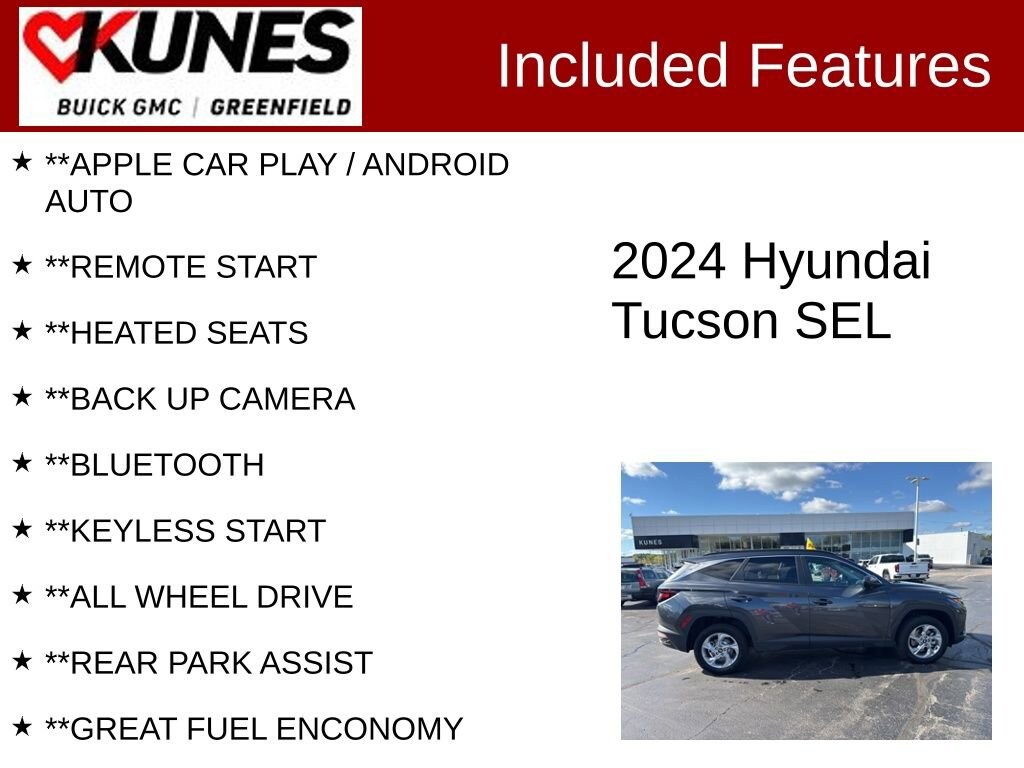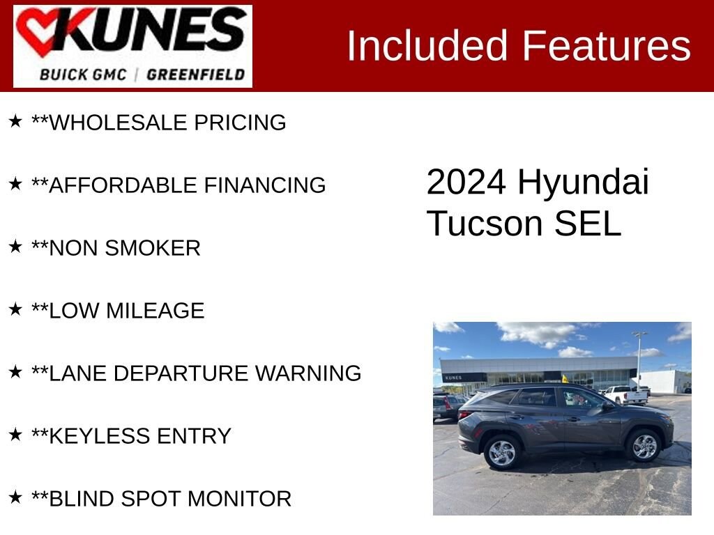 **APPLE CAR PLAY / ANDROID AUTO, **REMOTE START, **HEATED SEATS, **BACK UP CAMERA, **BLUETOOTH, **KEYLESS START, **ALL WHEEL DRIVE, **REAR PARK ASSIST, **GREAT FUEL ENCONOMY, **WHOLESALE PRICING, **AFFORDABLE FINANCING, **NON SMOKER, **LOW MILEAGE, **LANE DEPARTURE WARNING, **KEYLESS ENTRY, **BLIND SPOT MONITOR, AWD, Rear side impact airbag. CARFAX One-Owner. Certified. 23/29 City/Highway MPG Recent Arrival! Priced below KBB Fair Purchase Price!Dark Gray Metallic 2024 Hyundai Tucson SEL 4D Sport Utility AWD 8-Speed Automatic with SHIFTRONIC 2.5L I4 DGI DOHC 16V LEV3-SULEV30 187hpCertification Program Details:** NO FEAR LIFETIME CERTIFIED PREOWNED **Over $2,895 of value at no cost!*LIFETIME WARRANTY!*3 Day Exchange Policy!*Complimentary powertrain warranty with ability to upgrade to fully comprehensive coverage and/or extend up to 125,000 miles!*125+ Point Inspection by our factory trained ASE Certified technicians and reconditioned to the highest standards.*Complimentary AutoCheck History Report*Complimentary AutoCheck Buyback Protection*Financing for Everyone - Guaranteed credit approval regardless of credit history!*Over 30 lenders who compete to get you the best financing terms*No payments for up to 90 days!*Weekly, Bi-Weekly, and Monthly Payment Options for all buyers!*First Free Oil Change!*Trade anytime policy - cars, trucks, boats, RVs, motorcycles - as long as we donât have to feed it, you can trade it!Find out why our dealerships have won DealerRater.com DEALER OF THE YEAR a whopping 10 TIMES! Call, email, or live chat with one of our friendly sales professionals now to schedule your test drive! Prices shown do not include tax, title, registration and $499 service fees.