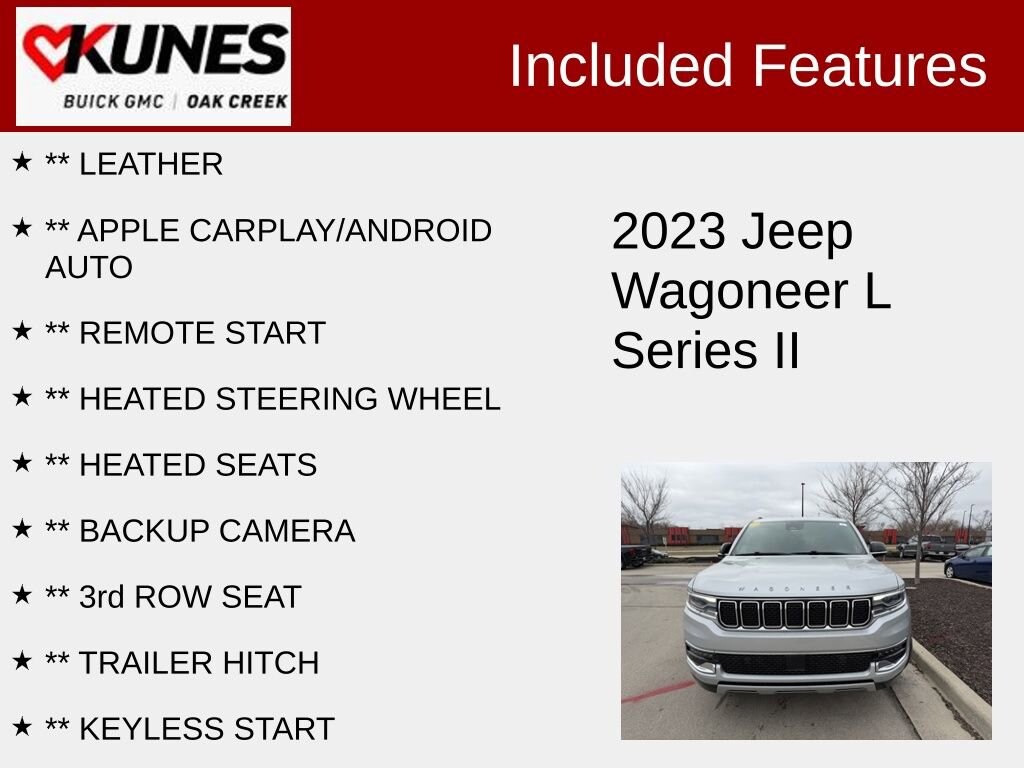 2023 Jeep Wagoneer L Series II Silver Zynith 4WD 3.0L I6Recent Arrival! Silver Zenith premium exterior color Tow hitch for towing capability Running boards for easy entry Blind spot monitoring for safer lane changes Rear parking aid and backup camera Navigation system with satellite radio and Bluetooth Premium sound system Heated steering wheel Power liftgate with hands-free access Power-adjustable driver and passenger seats with lumbar support and memory Front and rear air conditioning with multi-zone climate control Full-time four-wheel drive with 8-speed automatic transmission Lane departure warning and lane keeping assist Front collision mitigation LED headlights and fog lamps Heated mirrors with integrated turn signals Keyless entry, remote engine start, and smart device integration Third row seating and adjustable pedals 3.0L I-6 twin turbocharged engine Aluminum wheels and privacy glass Tire pressure monitoring and stability control