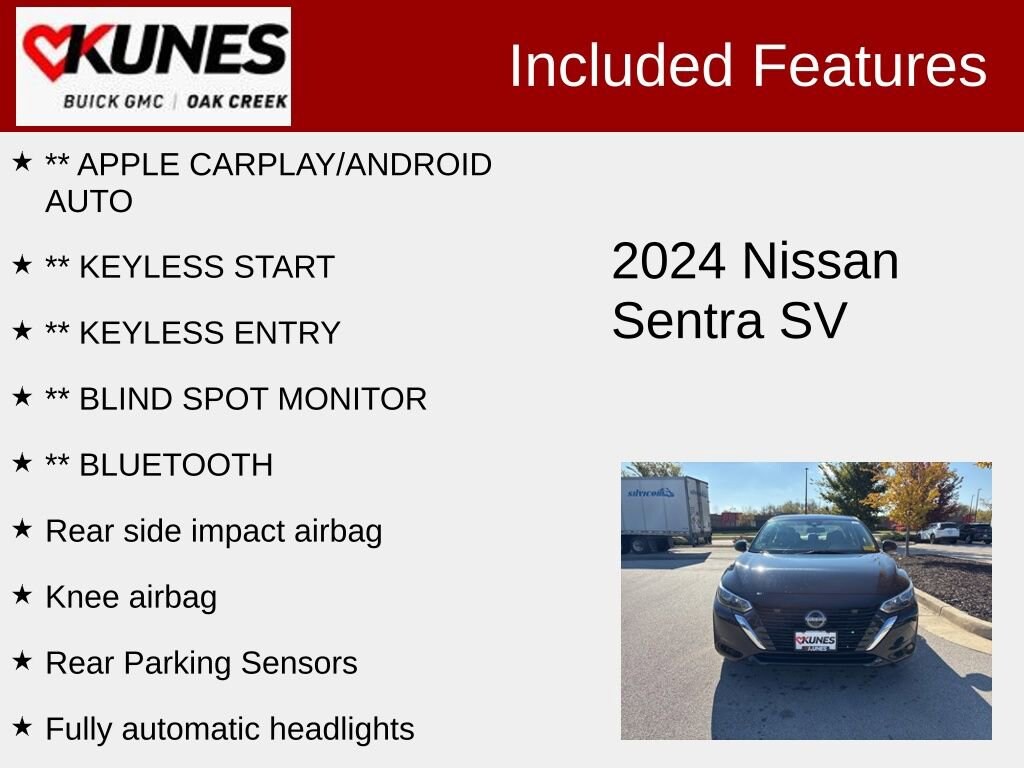 2024 Nissan Sentra SV Super Black FWD 2.0L I4 DOHCRecent Arrival! Clean CARFAX. CARFAX One Owner. Carpeted floor mats with trunk mat included Nissan Intelligent Key with push button ignition Apple CarPlay and Android Auto compatibility NissanConnect 8-inch color touchscreen display Blind spot warning system Rear cross traffic alert Lane departure warning Automatic emergency braking with pedestrian detection Rear parking sensors and backup camera 6-way adjustable driverâs seat 60/40 split folding rear seat Bluetooth hands-free phone system Streaming audio via Bluetooth Two front USB ports and one rear USB port Manual tilt and telescoping steering column Power windows with driverâs one-touch auto up/down Cruise control 16-inch alloy wheels Remote keyless entry LED headlights and signature daytime running lights Body-color outside mirrors and door handles