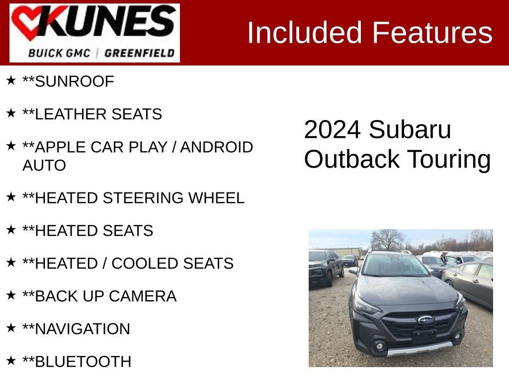 **SUNROOF, **LEATHER SEATS, **APPLE CAR PLAY / ANDROID AUTO, **HEATED STEERING WHEEL, **HEATED SEATS, **HEATED / COOLED SEATS, **BACK UP CAMERA, **NAVIGATION, **BLUETOOTH, **KEYLESS START, **ADAPTIVE CRUISE, **ALL WHEEL DRIVE, **REAR PARK ASSIST, **GREAT FUEL ENCONOMY, **WHOLESALE PRICING, **AFFORDABLE FINANCING, **NON SMOKER, **CLEAN CARFAX, **LOW MILEAGE! GREAT CONDITION!, **LOW MILEAGE, **LANE DEPARTURE WARNING, **KEYLESS ENTRY, **BLIND SPOT MONITOR, 12 Speakers, harman/kardon® Speakers, Low tire pressure warning, Power moonroof, Radio: Subaru STARLINK 11.6 Multimedia Nav System, Remote CD player, Speed control, Speed-sensing steering. CARFAX One-Owner. Clean CARFAX. Certified. 26/32 City/Highway MPG Recent Arrival!Gray Metallic 2024 Subaru Outback Touring 4D Sport Utility AWD CVT Lineartronic 2.5L 4-Cylinder DOHC 16VCertification Program Details:** NO FEAR LIFETIME CERTIFIED PREOWNED **Over $2,895 of value at no cost!*LIFETIME WARRANTY!*3 Day Exchange Policy!*Complimentary powertrain warranty with ability to upgrade to fully comprehensive coverage and/or extend up to 125,000 miles!*125+ Point Inspection by our factory trained ASE Certified technicians and reconditioned to the highest standards.*Complimentary AutoCheck History Report*Complimentary AutoCheck Buyback Protection*Financing for Everyone - Guaranteed credit approval regardless of credit history!*Over 30 lenders who compete to get you the best financing terms*No payments for up to 90 days!*Weekly, Bi-Weekly, and Monthly Payment Options for all buyers!*First Free Oil Change!*Trade anytime policy - cars, trucks, boats, RVs, motorcycles - as long as we donât have to feed it, you can trade it!Find out why our dealerships have won DealerRater.com DEALER OF THE YEAR a whopping 10 TIMES! Call, email, or live chat with one of our friendly sales professionals now to schedule your test drive! Prices shown do not include tax, title, registration and $599 service fees.