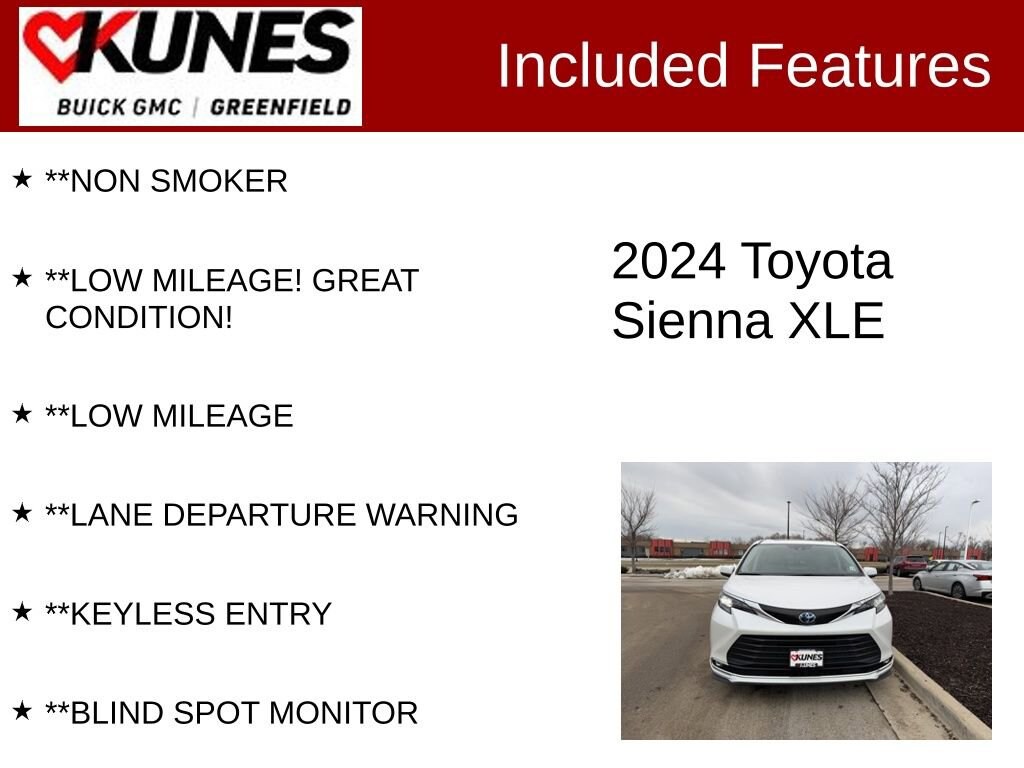 **LEATHER SEATS, **APPLE CAR PLAY / ANDROID AUTO, **REMOTE START, **HEATED SEATS, **BACK UP CAMERA, **NAVIGATION, **BLUETOOTH, **KEYLESS START, **GREAT FUEL ENCONOMY, **NON SMOKER, **LOW MILEAGE! GREAT CONDITION!, **LOW MILEAGE, **LANE DEPARTURE WARNING, **KEYLESS ENTRY, **BLIND SPOT MONITOR. CARFAX One-Owner. Certified. 36/36 City/Highway MPG Recent Arrival!Pearl 2024 Toyota Sienna XLE 8 Passenger 4D Passenger Van FWD CVT 2.5L I4Certification Program Details:** NO FEAR LIFETIME CERTIFIED PREOWNED **Over $2,895 of value at no cost!*LIFETIME WARRANTY!*3 Day Exchange Policy!*Complimentary powertrain warranty with ability to upgrade to fully comprehensive coverage and/or extend up to 125,000 miles!*125+ Point Inspection by our factory trained ASE Certified technicians and reconditioned to the highest standards.*Complimentary AutoCheck History Report*Complimentary AutoCheck Buyback Protection*Financing for Everyone - Guaranteed credit approval regardless of credit history!*Over 30 lenders who compete to get you the best financing terms*No payments for up to 90 days!*Weekly, Bi-Weekly, and Monthly Payment Options for all buyers!*First Free Oil Change!*Trade anytime policy - cars, trucks, boats, RVs, motorcycles - as long as we donât have to feed it, you can trade it!Find out why our dealerships have won DealerRater.com DEALER OF THE YEAR a whopping 10 TIMES! Call, email, or live chat with one of our friendly sales professionals now to schedule your test drive! Prices shown do not include tax, title, registration and $599 service fees.